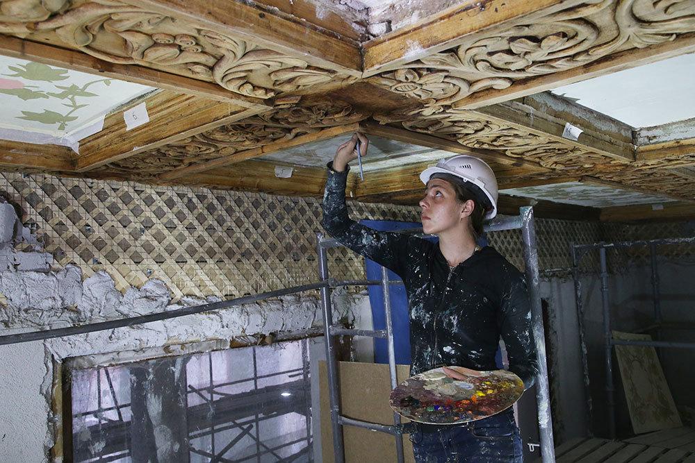 Этот фонтан вернется из небытия вместе с павильоном N 30, рядом с которым он находится. Многим павильон известен под названием "Микробиологическая промышленность", но исторически это были "Масличные культуры". Павильон уникальный - сделан из дерева, таких осталось мало. Одна из главных задач реставраторов - обработка для пожарной безопасности. И конечно, эксперты восстанавливают потолочную живопись. "Орнамент здесь необычный, на потолке изображен весь цикл цветения льна", - рассказывает художник Мария Иванова. Роспись была скрыта под слоем краски, и реставраторам приходилось подбирать смывку. Аккуратно, тампонами, небольшими участками раскрывали произведение. К одному и тому же участку мастерам порой приходится возвращаться по четыре раза.