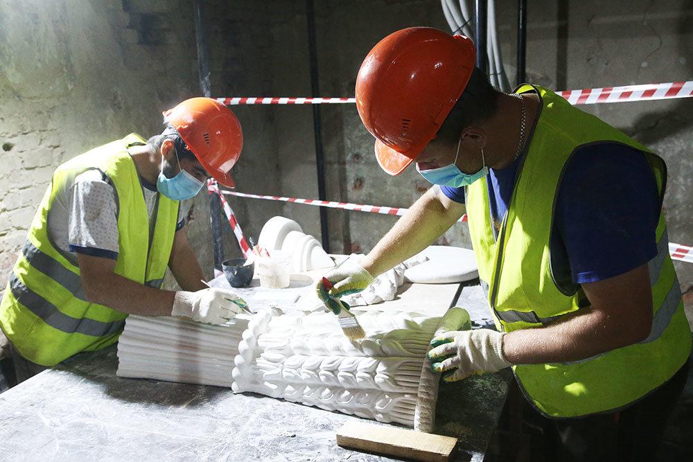 Результат оправдывает трудозатраты. Это видно по павильону N 15 "Радиоэлектроника и связь" (историческое название - "Поволжье"). Как и в случае с "Масличными культурами", ему стараются вернуть первоначальный вид. Залы были посвящены мотивам из жизни Саратовской, Куйбышевской, Ульяновской областей и всего хлебосольного края - Поволжья. Оригиналы живописных работ, которые некогда украшали потолок, реставраторы нашли на старых открытках. Сейчас "маэстро" полностью открыли потолок в зале Саратовской области. Крестьяне с гармоникой, люди в грузовике, комбайнер - все посвящено уборке урожая. Изображение обрамляет лепной орнамент, который тоже восстанавливают. Как добавляет Пурынов, в павильоне работает мастерская, где воссоздают утраченный лепной декор. Например, гипсовый сноп был развален почти полностью, от него осталась лишь четверть. Остальное доделывают, сверяясь с историческим оригиналом. Вернуть форму помогают гипсовые слепки. Мелкие детали снопа прорезают исключительно вручную. А под самым потолком в зале Сталинградской области находится его центральный элемент - купол с зенитным фонарем. Такие были во многих павильонах. Это было необходимо для естественного освещения. Павильоны строились для использования только в теплое время года, и зенитные фонари были оптимальны. Сейчас все делается с расчетом на круглогодичное использование. Поэтому павильон оснастят всеми современными инженерными системами, а сам фонарь будет с искусственным светом. Все реставрационные работы в "Поволжье" рассчитывают закончить в первом квартале 2021 года. И тогда жители всей страны смогут увидеть павильон почти таким же, каким он был в 1954-м.