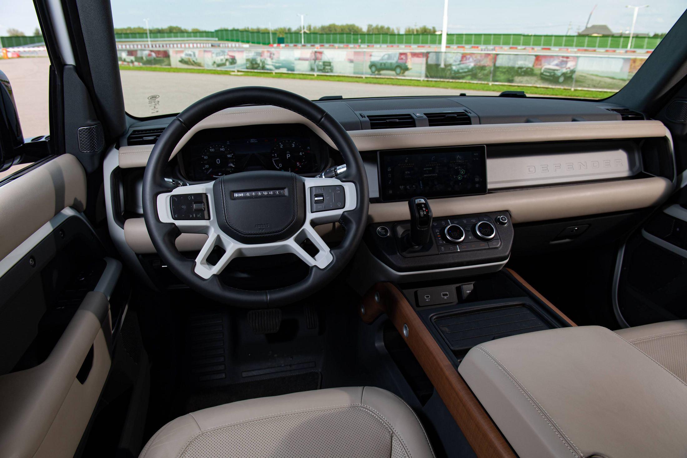 Самый простой Defender (о ценах позже) оснащен светодиодными фарами, двухзонным климат-контролем, электрообогревом лобового стекла, камерами кругового обзора и медиасистемой Pivi Pro с 10-дюймовым широкоформатным экраном и возможностью обновления ПО "по воздуху". Хочется верить, что по воздуху обновят и кое-какие мелочи с переводом - например, в меню выбора усилия на рулевом колесе пока что можно выбрать между тяжелым, средним и светлым (да, так русифицировали слово light).