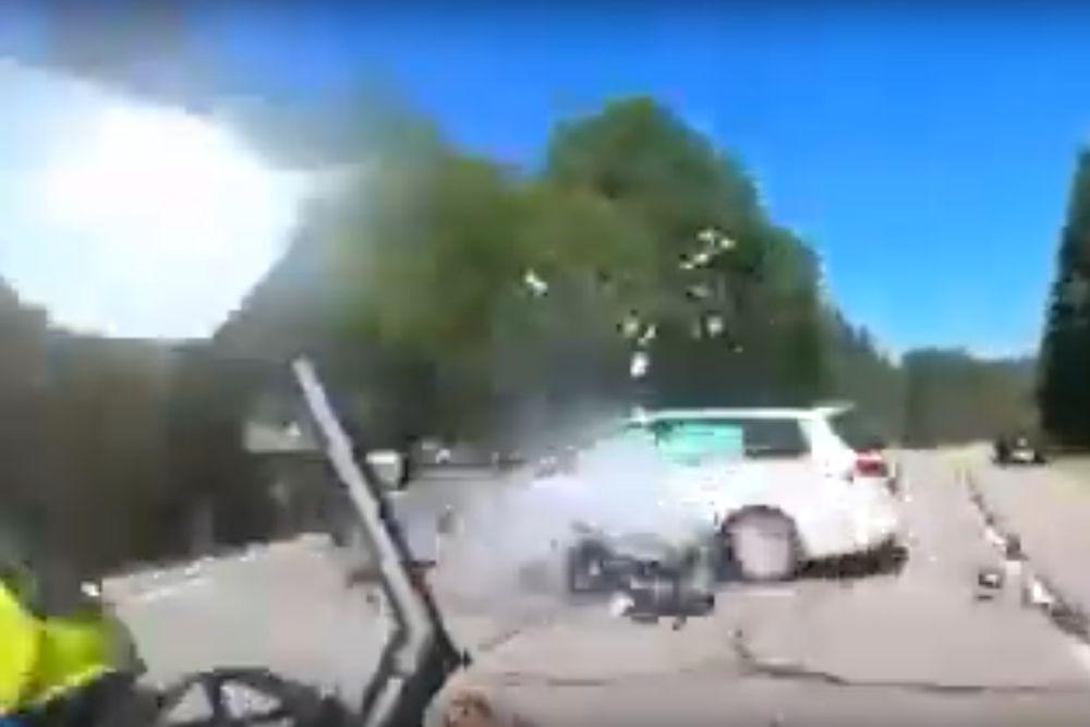 Видео: три байкера врезались на перекрестке в одну и ту же машину