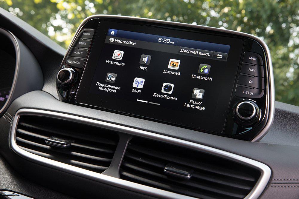 В салоне глаз цепляется в первую очередь за экран мультимедийной системы, который возвышается над торпедой. Несмотря на то, что монитор смотрит строго по центру, а не развернут в сторону водителя, читается он хорошо. Конечно, на нем остаются следы пальцев, но понятное меню и неплохая отзывчивость с лихвой перекрывают этот нюанс. Медиасистема поддерживает Apple CarPlay и Android Auto, поэтому в салоне можно разговаривать по телефону без рук и слушать свою музыку.