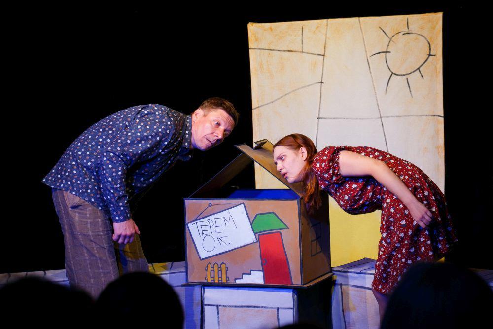Севастопольский Театр имени кукол представил спектакль "Tерем Ok.". Придумал его режиссер Артем Макеев. Это совсем не традиционная, всем известная с детства русская народная сказочка. Совершенно новое, оригинальное прочтение. На сцене всего двое актеров - Артем и Анна Пепелина. И лесные звери: мышка, лягушка, зайчик, лисичка, волк. Весело всем зрителям. Взрослые смеются от души. Детям дают стучать в барабаны во время действия, с ними разговаривают. Показывают, как можно мгновенно сделать куклу из самых обычных предметов. Например, лису - из полиэтиленового пакета, а мышку - из кондитерского шприца с насадками.