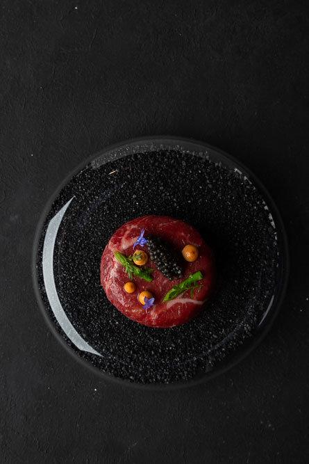 многослойное, как торт, карпаччо из гатчинской говядины, белых грибов и черной икры,