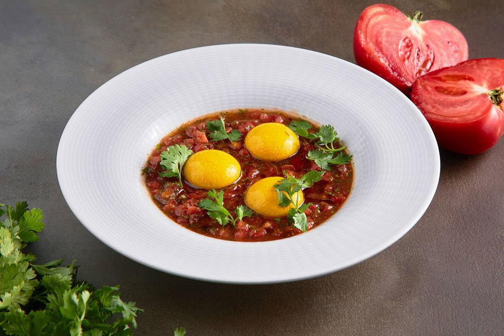а пряными томатами с молодым сыром - на израильскую шакшуку. Роль яиц в последнем случае остроумно играет подкрашенный морковным соком креметте (нежный творожный сыр).