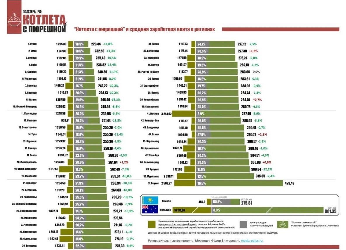 В каждом втором городе (50 процентов) стоимость "Котлеты с пюрешкой" составляет более 20 процентов от размера номинальной начисленной заработной платы за месяц (в пересчете на день). В июне таких было более 80 процентов. В столице на еду нужно зарезервировать 9 процентов среднего заработка (аналогичный показатель обнаружен в Мельбурне), в Санкт-Петербурге - 11.