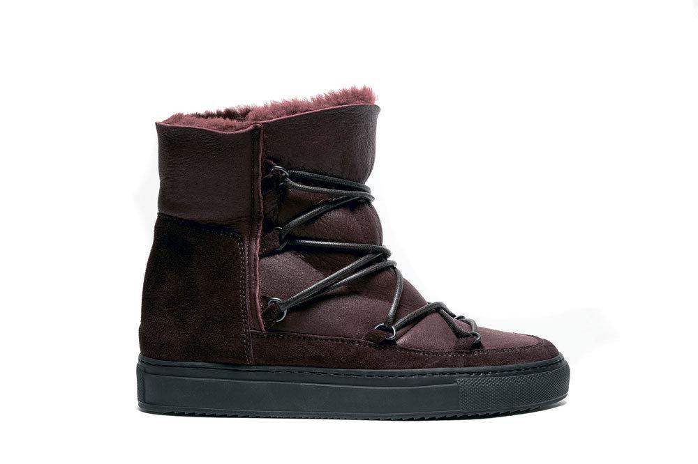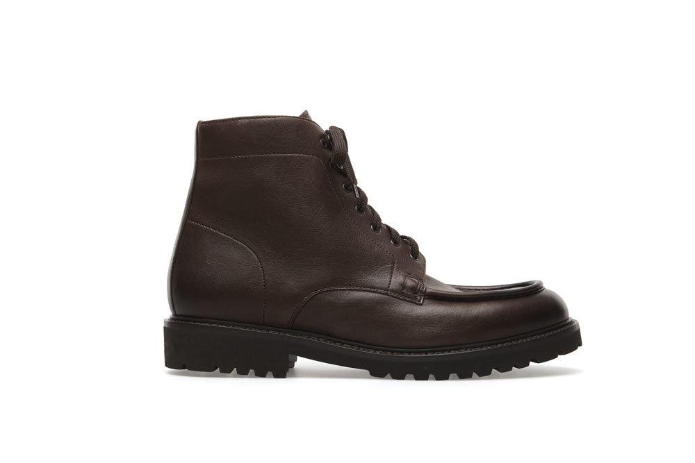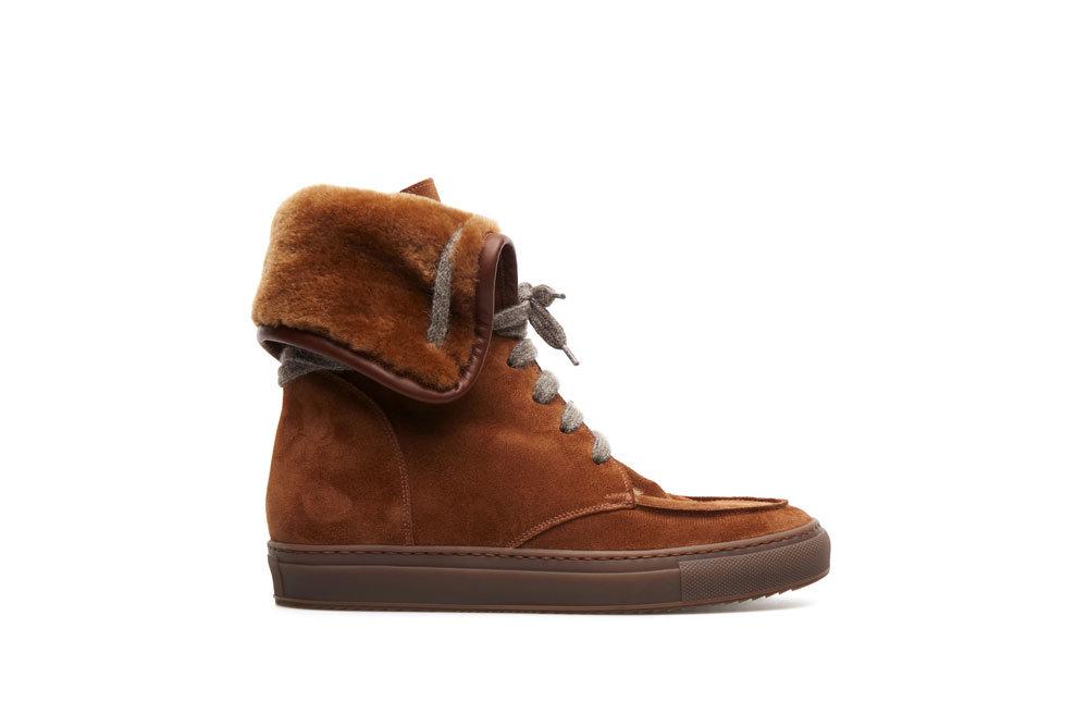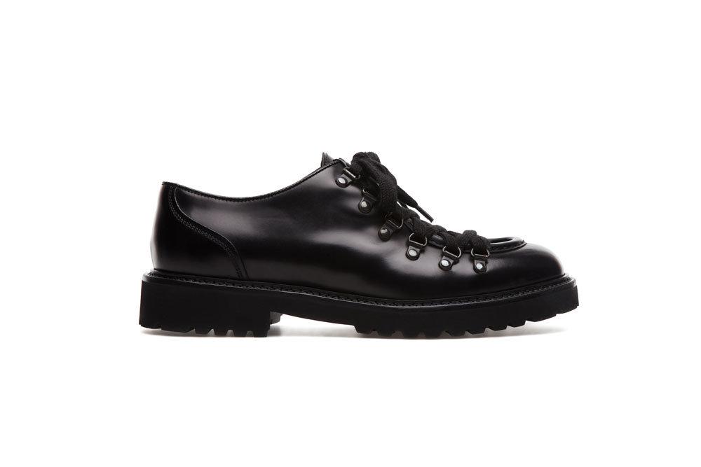 Другая модель напоминает стиль легендарных трекинговых ботинок "Санкт-Мориц" и выполнена из матовой телячьей кожи с резиновой подошвой. Обратите внимание на "горную" шнуровку с металлическими петлями и шерстяные шнурки.