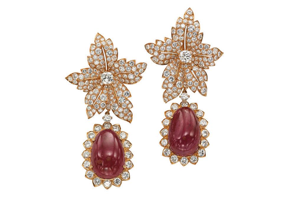 Украшение навеяно моделью серег Van Cleef & Arpels, которые Аристотель Онассис преподнес Жаклин в качестве свадебного подарка в 1968 году. Она не раз появлялась на публике в этих крупных "цветочных" серьгах с инкрустацией из бриллиантов и подвесками в виде рубинов-кабошонов.
