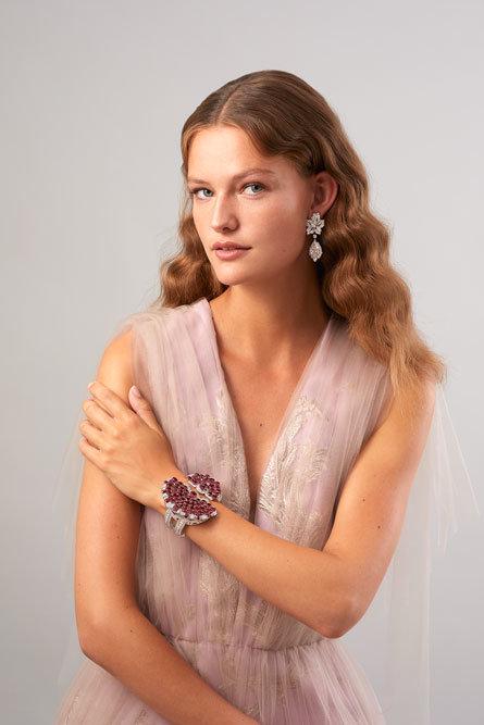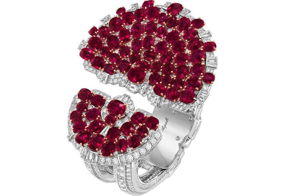 Камни, тщательно отобранные геммологами дома, получили огранку "кушон" ("подушка"). Рубинами всех оттенков, от красного до пурпурного, усыпаны два полукруга различного диаметра, эффектно подчеркивающие запястье. Ажурная конструкция из белого золота, инкрустированная бриллиантами, уравновешивает украшение. Архитектурная форма и изобилие драгоценных камней - новый браслет действительно великолепен.