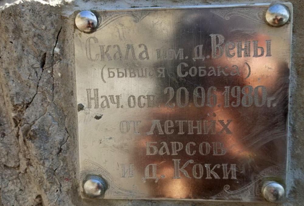 Гигантский валун на берегу небольшой бухты Любви стал объектом туристического вандализма. По соцсетям гуляют фотографии мужчины в красных шортах, который с помощью лестницы вскарабкался ближе к верху камня и с помощью электродрели прикрепил к нему табличку с надписью "Скала им. д.Вены. Нач. осв. 20.06.1980г. От летних барсов и д. Коки". Дядя Веня - это, скорее всего, сам турист, решивший информировать всех отдыхающих на пляже, что он начал осваивать это прекрасное место под Новым Светом еще в 1980 году. Табличку он решил укрепить не только металлическими болтами, но и цементным раствором.