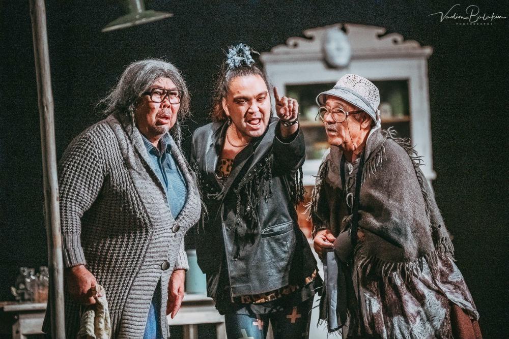 Режиссер Сергей Потапов (Якутск, Республика Саха), поставивший в Хакасском национальном драматическом театре имени А.М. Топанова "Калеку с острова Инишмаан", трагикомедию, решил спектакль очень интересно: артисты исполняют не ирландские песни и танцы, как это обычно видим в постановках по МакДонаху, а свои, хакасские, даже надевают национальные костюмы, а роли тетушек калеки Билли и мамаши Пустозвона исполняют мужчины. Пустозвон, разносчик новостей, "местное радио", превратился в женщину-сплетницу, в мини, ярких колготках и на каблуках. Но, к сожалению, режиссера на фестивале не было, поговорить с ним не удалось.