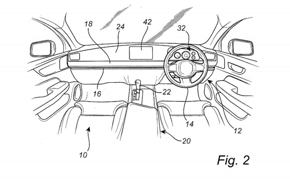 В патенте описывается схема расположения рулевого колеса, которое закреплено на специализированной рельсе, позволяющей ему передвигаться между креслами. Направляющие могут быть применены также для рычага управления коробкой передач и сидений. В патенте описывается в том числе такое положение органов управления, при котором водитель сидит посередине.