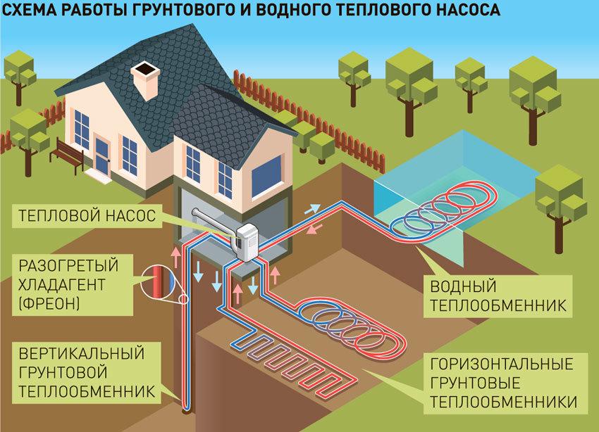 Водяные тепловые насосы более надежные. Но для них нужен либо водоем в пределах участка, либо бурение двух достаточно глубоких скважин на расстоянии не менее 20 метров друг от друга. Самыми универсальными считаются грунтовые тепловые насосы. Геотермальные трубки нужно прокладывать ниже глубины промерзания температуры грунта, перекопав свой участок подобно кротам (горизонтальная установка) или пробурив достаточно глубокие скважины (вертикальная установка). Считается, что тепловой насос позволяет получить 70-80% тепла для обогрева дома бесплатно. Но цена на устройство кусается. А с учетом монтажа кажется совсем неподъемной.