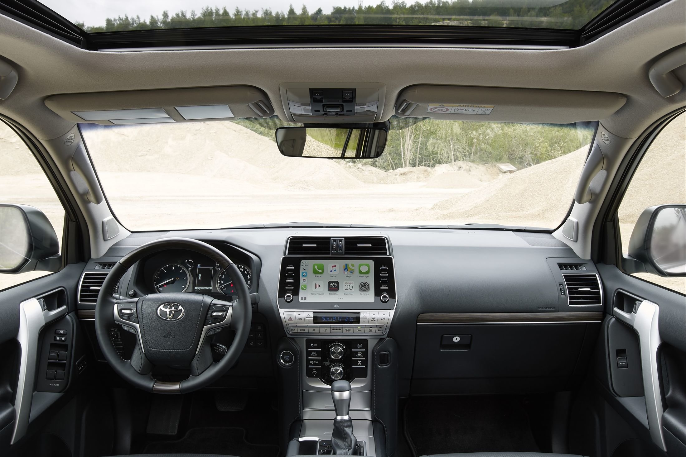 Размер дисплея увеличился с 8 до 9 дюймов, изменились операционная система и интерфейс. Впрочем, все это мы уже видели на других моделях марки. Со сменой "мультимедийки" Prado получил и Apple CarPlay с Android Auto - естественно, пока они работают через кабель. Камера заднего вида с низким разрешением осталась прежней. На месте осталось все остальное, начиная с трех крошечных кнопочек настройки часов на панели, заканчивая некоторыми спорными решениями в эргономике.
