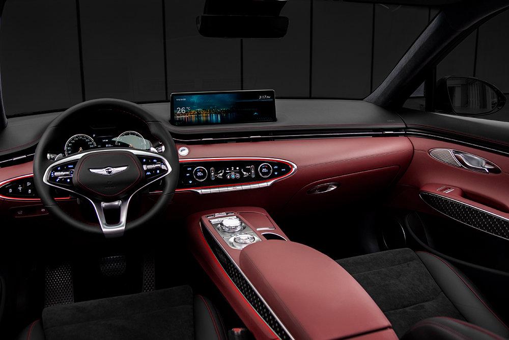 Cалон GV70 Sport выделяют материалы отделки, трёхспицевый руль и карбоновые вставки в торпедо и дверях.