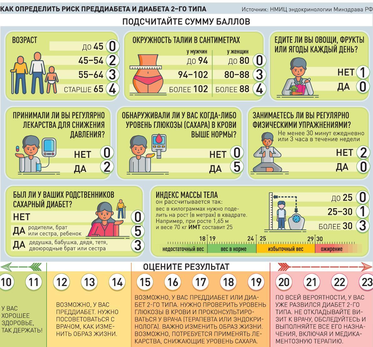 По оценкам специалистов НМИЦ эндокринологии, в России сейчас уже 20 миллионов людей находятся в состоянии предиабета, а число диабетиков превышает 8 миллионов человек. Понять, предрасположен ли человек к диабету, высок ли риск заболеть, можно и с помощью простого теста (см. рис.). Если по результатам вы попали в группу риска - не откладывайте визит к эндокринологу, даже если чувствуете себя хорошо, обследуйтесь и примите меры.