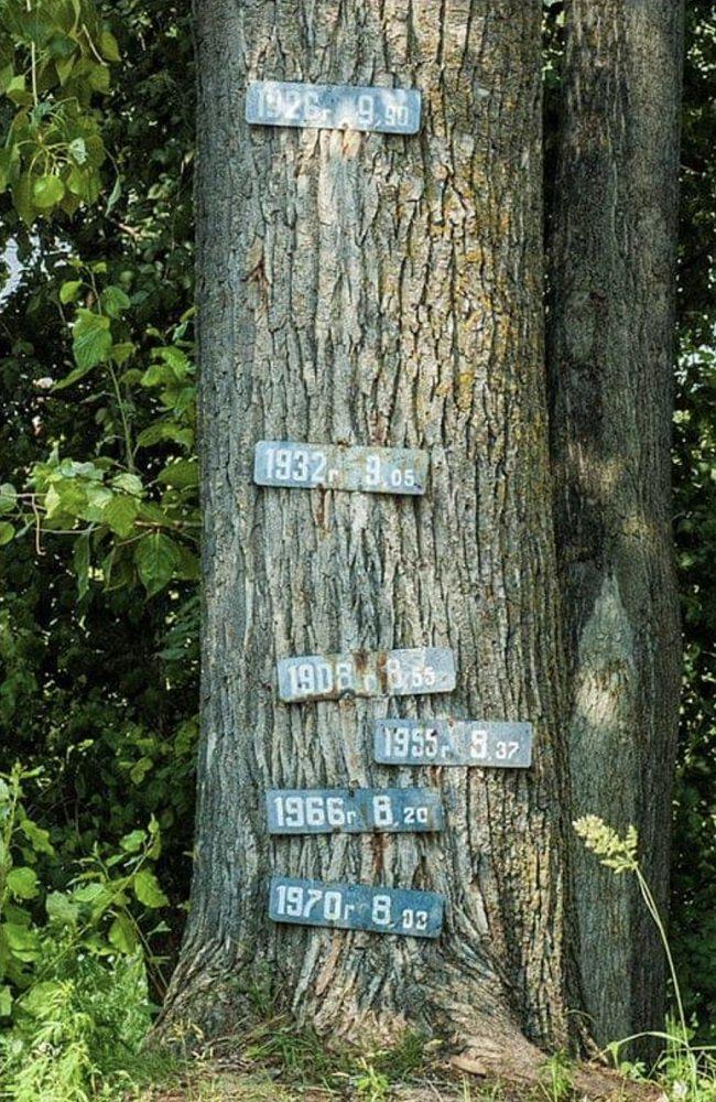 Этот снимок я сделал в начале нулевых у поймы Клязьмы в Гороховце. Рядом - приток Клязьмы - Лух и Ока, куда впадает Клязьма. Таблички, прикрепленные к дереву, отмечают уровень паводковых вод Клязьмы в разные годы. Судя по ним, самый высокий разлив был в 1926 году - без малого 10 метров. 9 метров - в 1932-м. 8,5 - в 1908-м. 8,2 - в 1966-м. Почти ровно 8 метров - в 1970 году. В нулевые до этого дерева от реки нужно было подниматься по довольно крутому склону метра три...