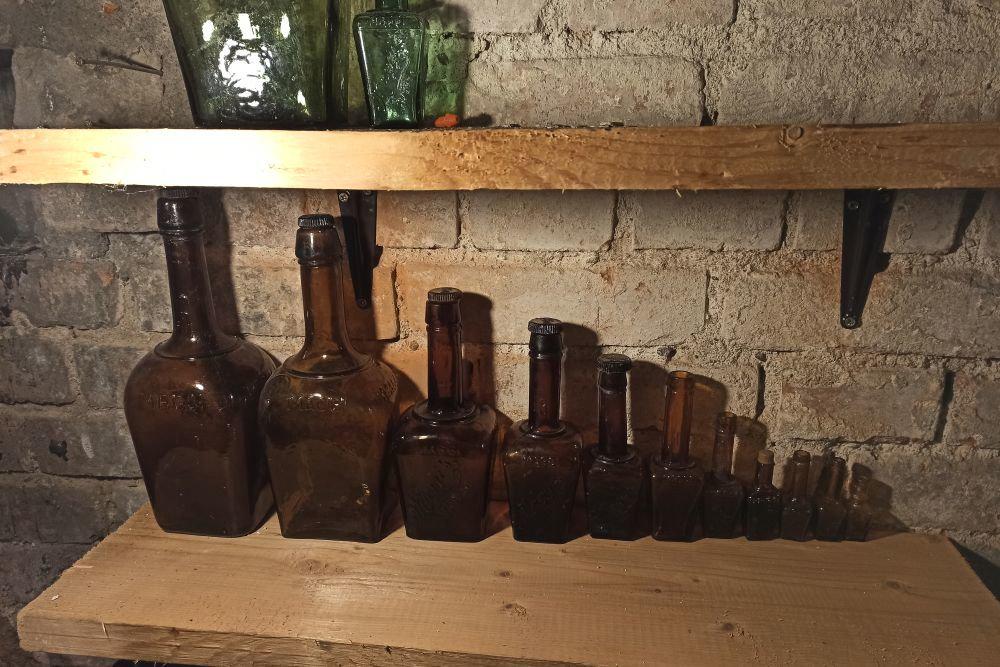 Так коллекцию военных экспонатов дополнила коллекция предметов быта. Вот набор стеклянных бутылочек из-под соусов Maggi. Какие-то датированы началом прошлого века, какие-то - концом позапрошлого. Вот аптечная полка со стеклянными бутыльками из-под порошков и микстур, в некоторых на донышке сохранились лекарства. Рядом - зубные щетки и бритвенные принадлежности, ведь в начале ХХ века парфюмерия в Германии продавалась в аптеках.