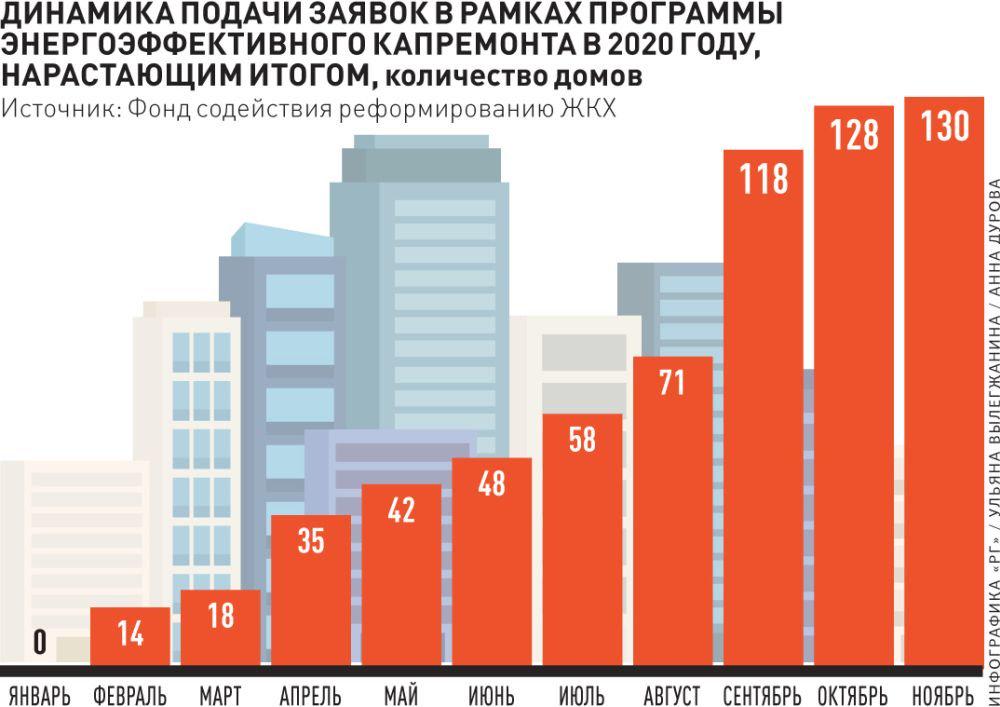 - С начала текущего года Фондом ЖКХ одобрено 38 заявок на капитальный ремонт 130 домов, механизмом господдержки энергоэффективного капремонта воспользовались 27 субъектов РФ. Общая расчетная экономия по одобренным заявкам составляет 131 миллион рублей ежегодно, из них 75 миллионов рублей - это только по заявкам, рассмотренным Фондом ЖКХ в 2020 году.