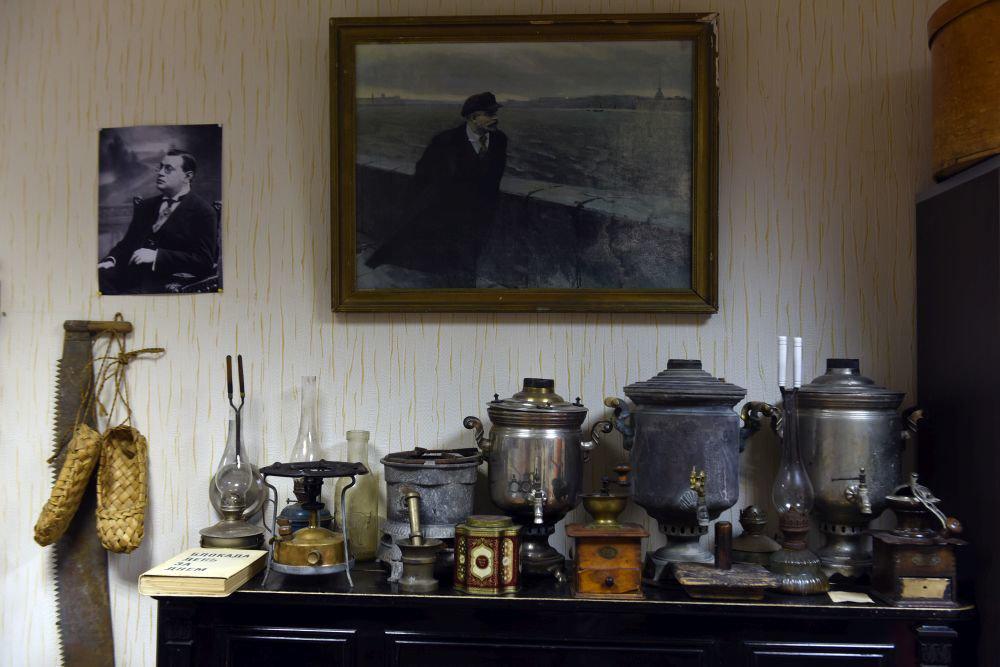 Член инициативной группы историк и географ Леонид Колотило показывает экспонаты, которые пока хранятся в правлении ТСЖ.?Вот дореволюционный холодильник, которым поделился житель дома историк Александр Романов. Холодильным элементом в нем был колотый лед, который загружали в особый отсек. Лед таял, воду с помощью краника сливали и загружали новую порцию льда. Огромная шляпная коробка - найдена, как и многие другие предметы, на чердаке при разборе завалов. На старинной кофемолке (подарок одного из жителей) обещают молоть кофе, чтобы угощать гостей музея. Исполинская чугунная плита с духовкой - тоже дар. Свечной фонарь, подковы, елочные игрушки, прялки, керосиновые лампы, части от внутриквартирных дверей...