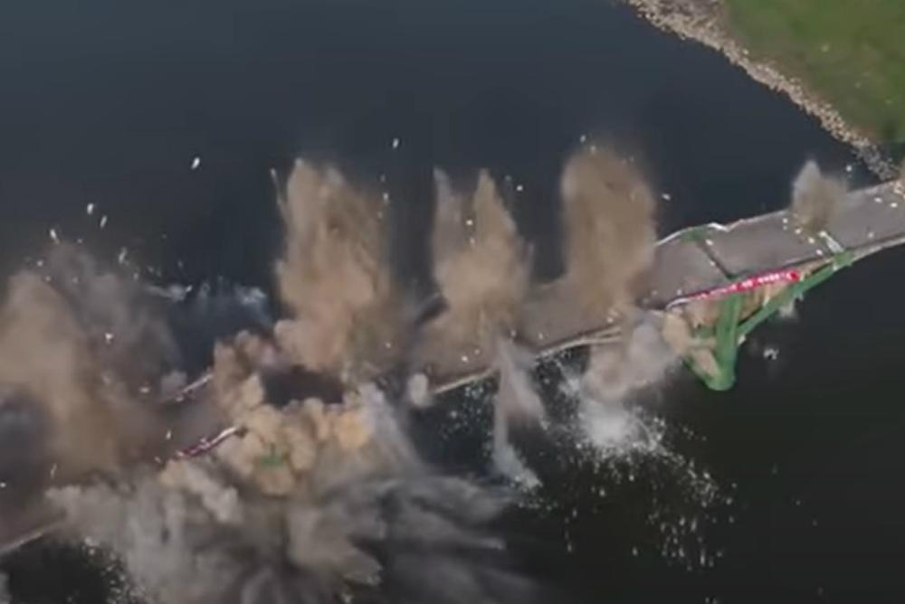 По всей длине моста взрывотехники заложили несколько десятков зарядов, которые были приведены в действие один за другим, после чего от него осталась лишь груда бетонных обломков.