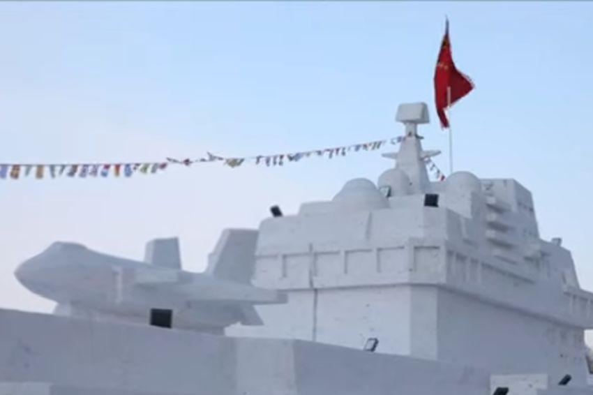 Китайское телевидение показало сюжет об авианосце, вылепленном из снега в Харбине. Команда из 19 энтузиастов построила 50-метровый корабль за три недели.