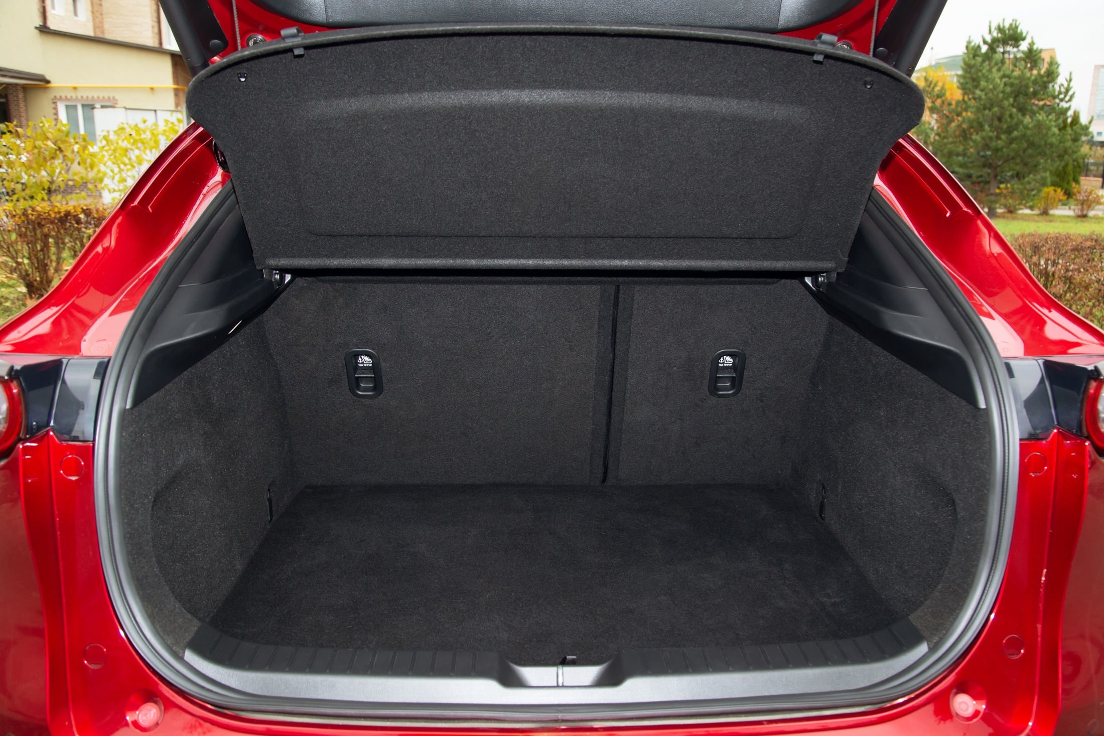 Багажник у CX-30 гораздо меньше грузового отсека CX-5: 295 литров против 440. К сожалению, никаких полочек и ниш для мелких предметов не предусмотрено. Крючков для сумок и пакетов также не найдете. Нет и дополнительной розетки на 12 вольт. Под полом - докатка. Все.