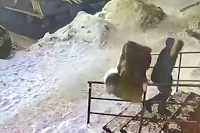 Видео: Жительница Кузбасса чудом спаслась от летевшей с крыши глыбы