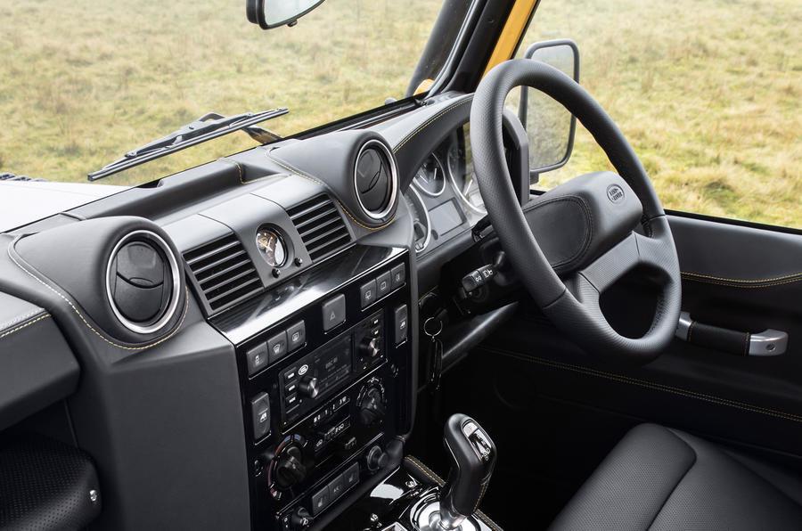 Defender Works V8 укомплектован также внедорожными покрышками на стальных штампованных дисках. В салоне автомобиля - спортивные сиденья Recaro спереди с отделкой из натуральной кожи (комбинация черного и песочного цветов) и медиасистема Land Rover Classic со спутниковой навигацией.