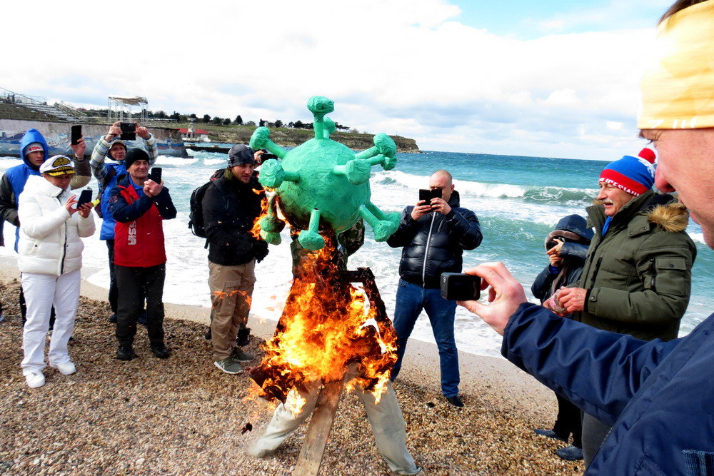 После угощения из полевой кухни, о которой позаботился атаман Севастопольского городского казачьего общества "Русь" Вячеслав Бебнев, участники слета "моржей" под всеобщее ликование сожгли чучело коронавируса. Это стало изюминкой веселого и оптимистичного оздоровительно-спортивного состязания.