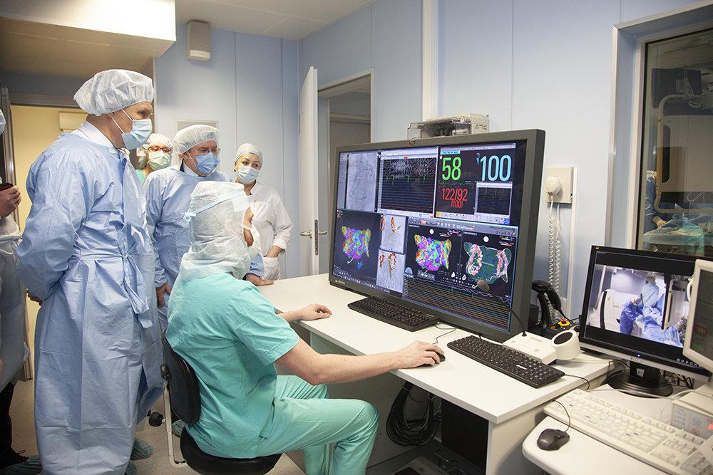 В операционных Михаил Мурашко особое внимание обратил на возможности новосибирских специалистов по интервенционному лечению тяжелой аритмии с использованием единственной в России роботизированной навигационной системы Stereotaxis Niobe.