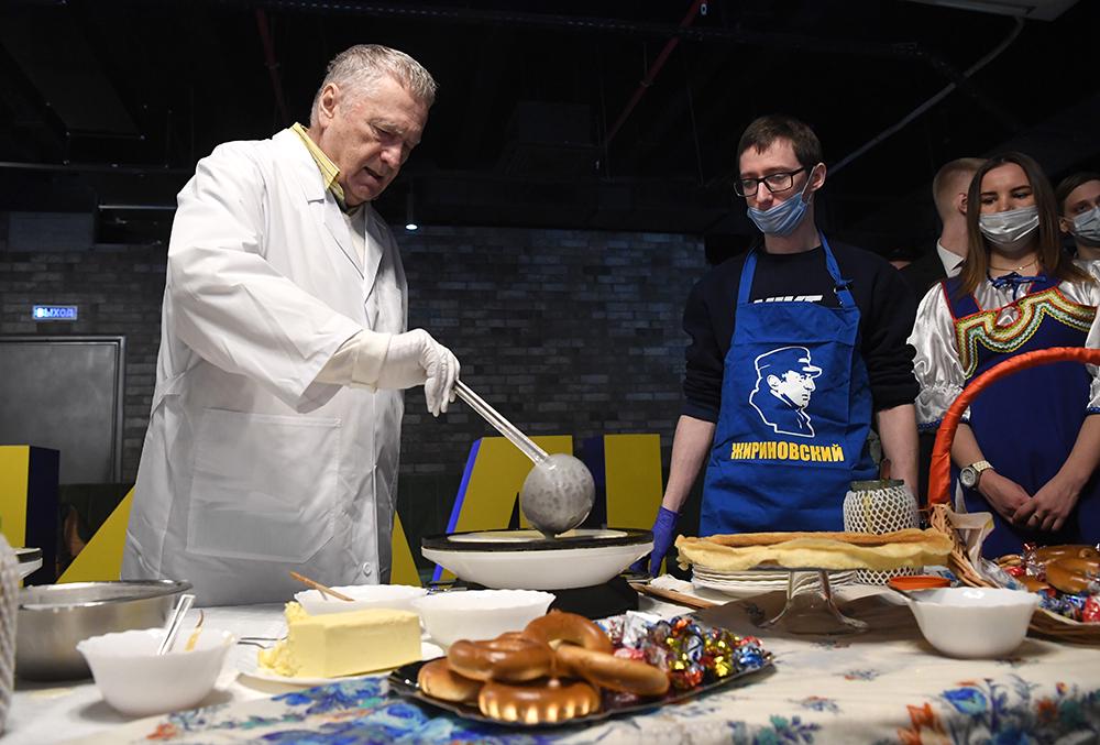 Лидер ЛДПР Владимир Жириновский в субботу встретился со студентами Института мировых цивилизаций и в честь Масленицы сам испек для собравшихся блины.