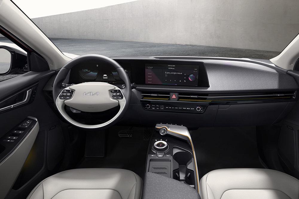 Kia EV6 получил единый дисплей приборной панели и мультимедиа, характерно минимальное количество физических клавиш. Тонкие сиденья имеют отделку из переработанного пластика.