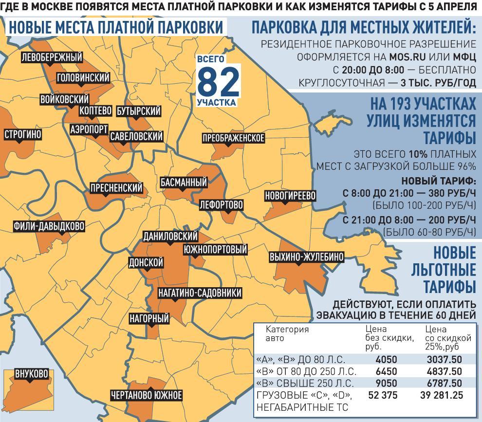 Часть парковок станет платной впервые. В Пресненском, Басманном, Савеловском, Аэропорт, Даниловском, Донском, Нагорном, Бутырском и других районах счетчик платной стоянки включится на улицах, где расположены торговые и офисные центры, парки и магазины, куда съезжаются москвичи со всего города. Всего появится 82 платных участка. Часть мест на них будут доступны за деньги для всех водителей, а часть будут предназначаться только для владельцев парковочных разрешений.