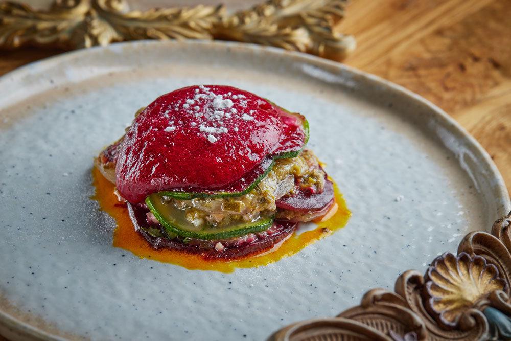 Знаток русской кухни и ее неустанный исследователь Влад Пискунов в ресторане "Матрешка" готовит овощной мильфей, где запеченные овощи и фрукты выложены слоями под пеной из свекольного рассола. В составе - запеченная в течение 10 часов при низкой температуре свекла, лук-порей с копченым чесноком, груша, грецкий орех. Помимо "многодельности", эту закуску надо отметить за жизнерадостность цвета и за яркий вкус, в котором сладость корнеплода и фрукта встречаются с интересными "дружащими" текстурами.