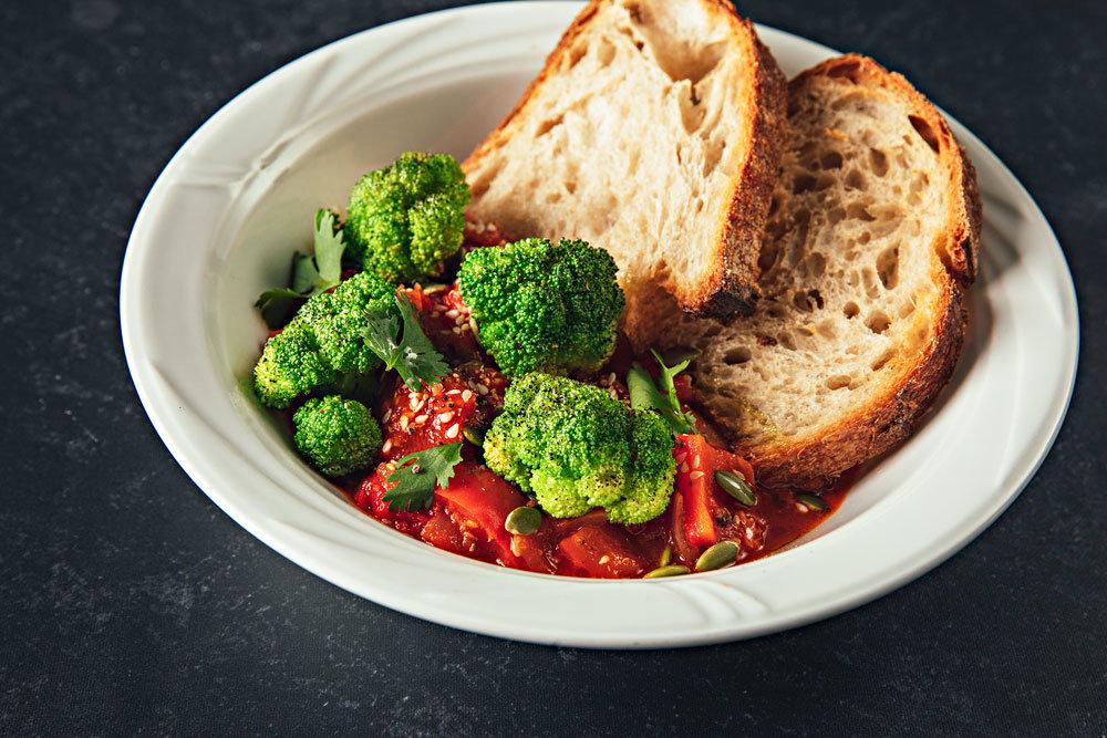 Разноцветная, сочная и ароматная шакшука впитала все краски и вкусы Ближнего Востока. Но и она может стать постным блюдом - шеф-повар кафе-пекарни "Печорин" Евгений Александров доказал, что для него нет ничего невозможного. Вместо обязательных для шакшуки яиц он использует печеный батат, брокколи с оливковым маслом и розмарином. Основной секрет - в идеальной гамме вкусов и ароматов классического соуса матбуха. Для него нежные томаты пилати и болгарский перец томятся в масле, впитавшем ароматы тимьяна, лука, чеснока, зиры и копченой паприки. Перед этим специи обжариваются на сухой сковороде отдельно - так они сильнее раскрываются. Кусочек свежеиспеченного бездрожжевого хлеба и много кинзы - вот идеальные компаньоны для постной шакшуки, которую при подаче еще и обильно посыпают семечками кунжута и тыквы.