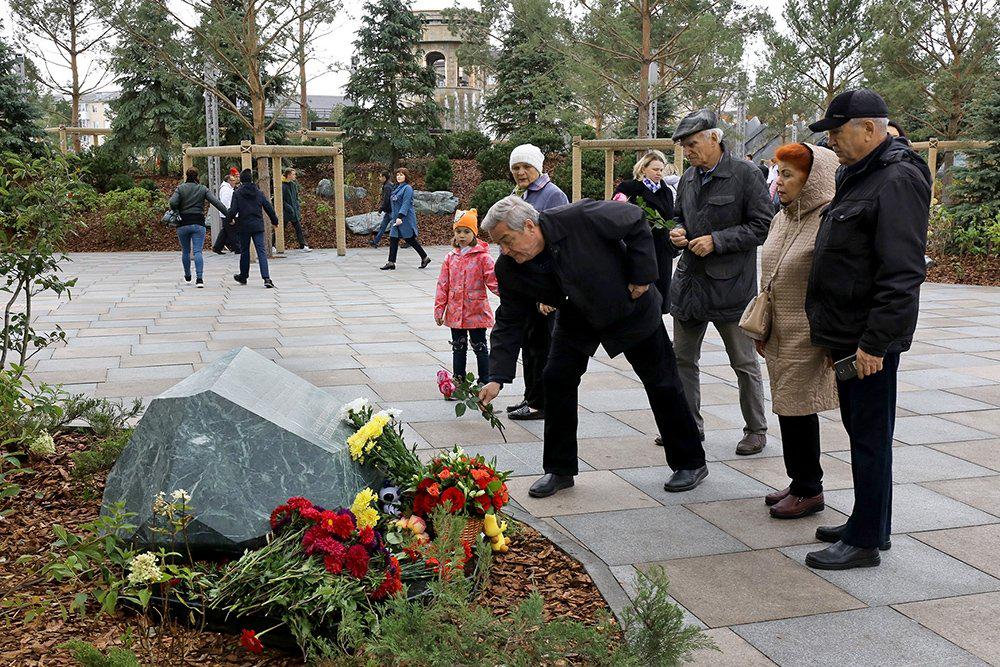 Памятный камень установили на месте стихийного мемориала, где в том страшном марте среди цветов очень долго горели лампады. А через полтора года вместо сгоревшего торгово-развлекательного центра в городе появился необычный парк. Он шумит хвойными кронами. Сосен ровно шестьдесят.