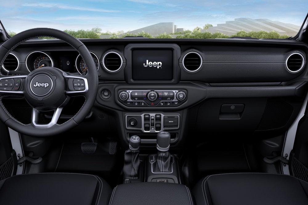 Внутри юбилейный Wrangler отличает тёмная отделка, сиденья и панель с контрастной прострочкой, соответствующие шильдики. Машина оборудована 8,4-дюймовым информационно-развлекательным комплексом (поддерживает Apple CarPlay и Android Auto), аудиосистемой Alpine с девятью динамиками и сабвуфером мощностью 552 Вт.