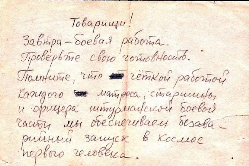 Такой уникальный "боевой листок" перед особо важной работой прислал в народный проект "Мой Гагарин" Анатолий Серков из Ухты. В 1961-1965 годах он служил в должности машиниста-турбиниста флагманского корабля "Сибирь" Тихоокеанской гидрографической экспедиции - ТОГЭ-4 в звании матроса. Под таким названием работал отряд из четырех кораблей Тихоокеанского флота Минобороны, выполнявших особое задание.