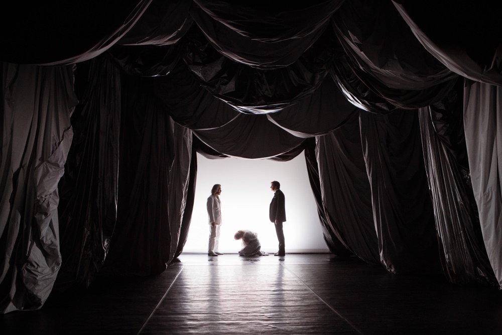 В театре Моссовета и все, что касается служб - звука, света, помощника режиссера - прекрасно налажено, ты ощущаешь надежный тыл. У меня разные истории были. Я репетировал в одном театре, где у меня звукорежиссер выпал из рубки, потому что был пьяный. Всяко бывает. Но вот тут я четко понимаю, что все будет идеально. Очень хорошую художницу Анастасию Бугаеву мне предложил Марчелли, она привела потрясающего художника по свету Нарека Туманяна. И нам сделали фантастическую декорацию с шестью занавесами. Необычная позиция, в принципе, тем более, что это сцена "Под крышей", где не может быть никаких нагромождений.
