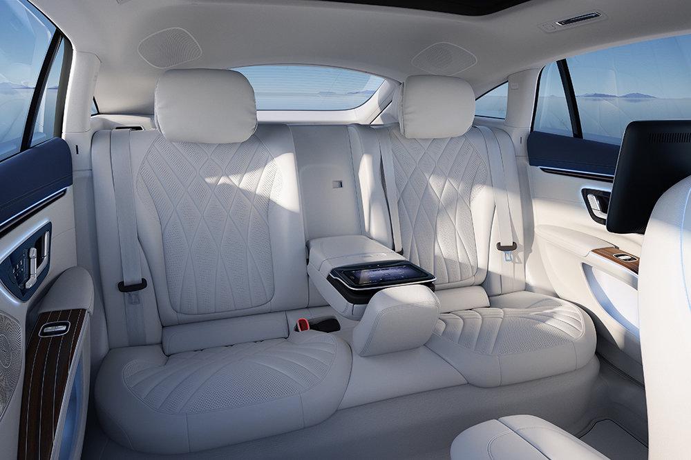 Mercedes-EQ EQS может быть оснащён матричной оптикой, которая умеет рисовать на дороге подсказки (это аналогично проекционном дисплею 77 дюймов), автоматическими дверями, сиденьями с подогревом, вентиляцией и массажем, планшетами для задних пассажиров, аудиосистемой Burmester мощностью 710 Вт, панорамной крышей и кучей ассистентов.
