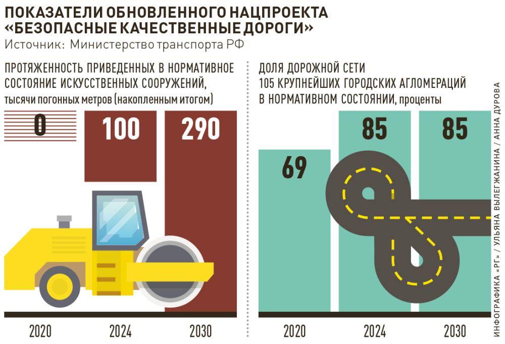 Название национального проекта также претерпело изменения. Ранее он именовался "Безопасные и качественные автомобильные дороги", сейчас - "Безопасные качественные дороги" (БКД). Основной целевой показатель БКД связан с долей дорожной сети в крупнейших городских агломерациях, соответствующей нормативным требованиям. В 2020 году доля составляла 69 процентов, а к 2024 году она должна увеличиться как минимум до 85 процентов.