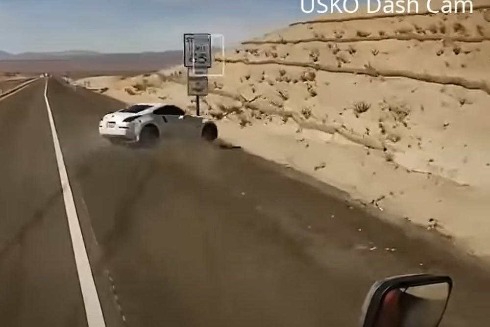 Налетев на горку, купе взмывает в воздух, его разворачивает и крутит вокруг своей оси с бешенной скоростью около десяти оборотов! Туча пыли, по сторонам разлетаются обломки бамперов, колеса - авария выглядит действительно ужасно и кажется, что уцелеть в ней невозможно. Тем не менее, ни водитель Nissan, ни женщина, находящаяся с ним в машине, не пострадали.