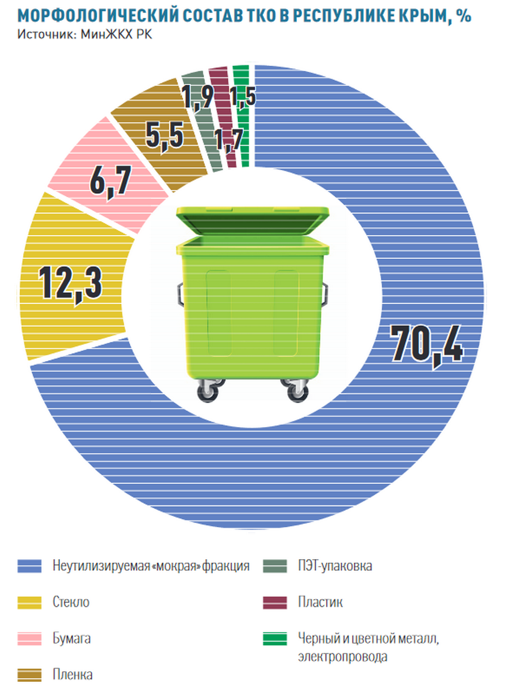 В Симферополе с конца 2020 года началась установка желтых контейнеров для раздельного сбора мусора, их число достигло 120. Около 100 таких контейнеров для пластика, ПЭТ, металла и бумаги установят к курортному сезону в Евпатории. А в целом в республике их будет более 2000. Но это лишь первый шаг к выполнению поставленной правительством РФ задачи: к 2030 году добиться извлечения 50 процентов вторичных материальных ресурсов из массы отходов. Такие показатели помогли бы вдвое сократить захоронение отходов и вдвое уменьшить использование первичных ресурсов.