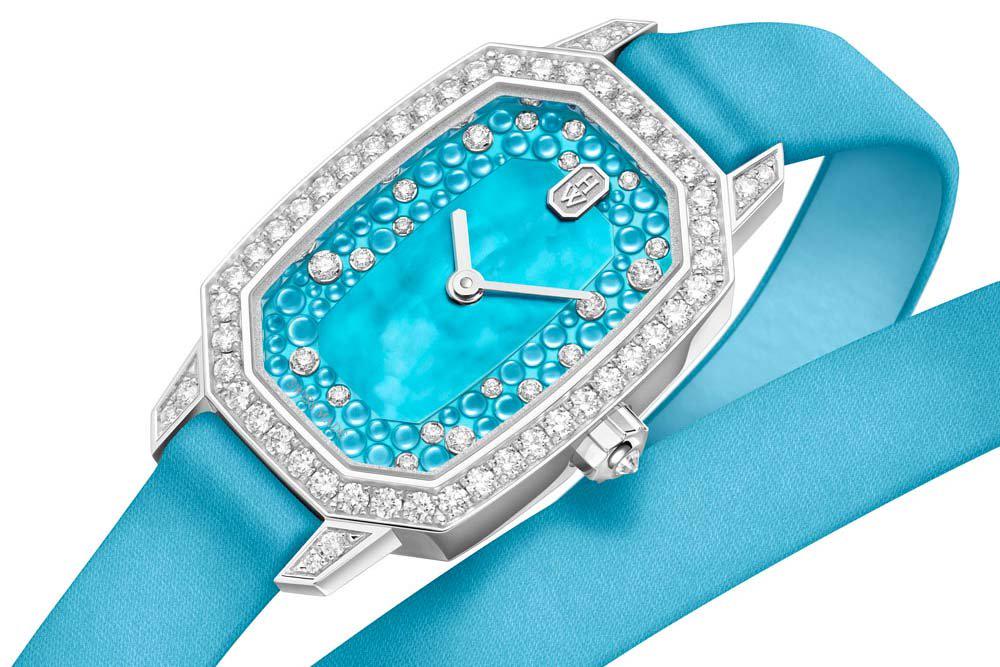 Периметр перламутрового циферблата украшен кабошонами из натурального перламутра. В комбинации с живым блеском 20 бриллиантов классической огранки кабошоны создают эффект "шипучих пузырьков" или миниатюрных воздушных шариков.