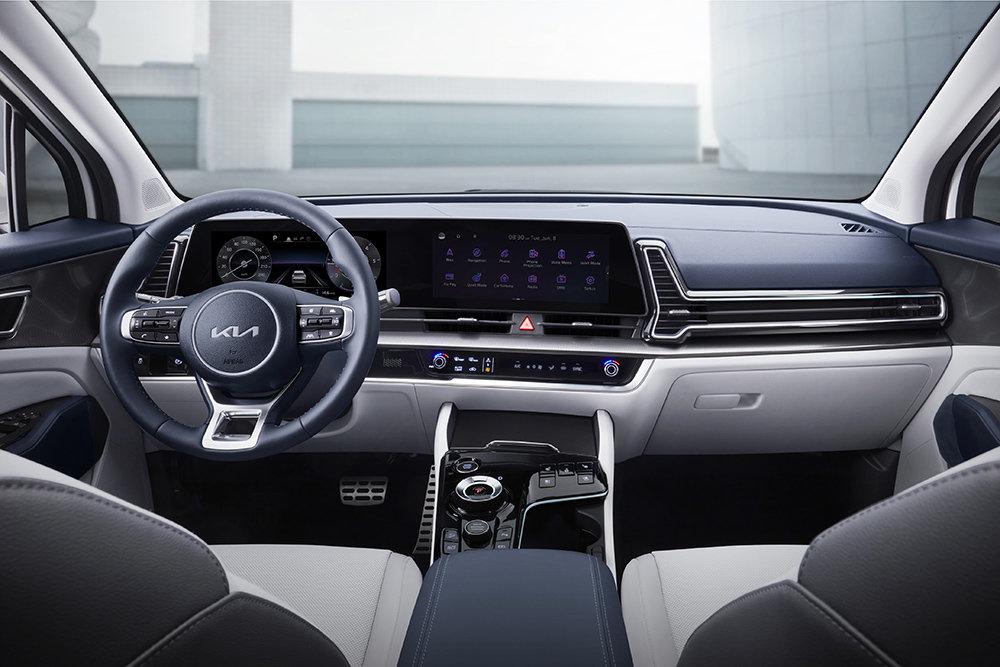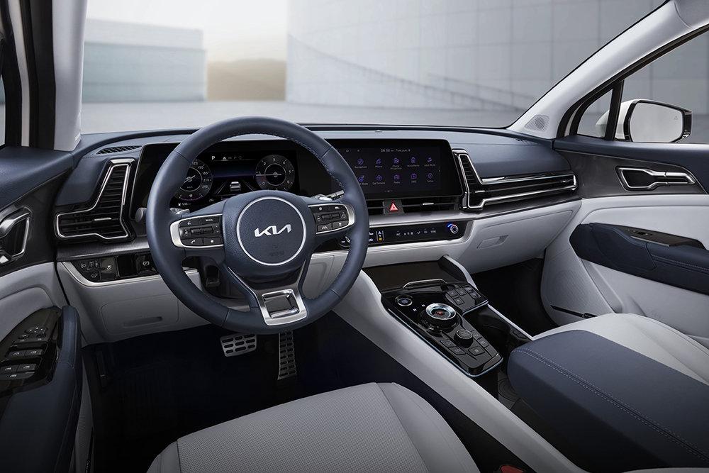 Интерьер нового Sportage показали в обычной комплектации. Секретом не было, что кроссовер получит изогнутую панель, состоящую из экранов цифровой приборки и мультимедийной системы.