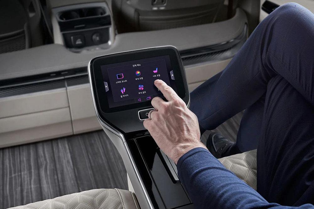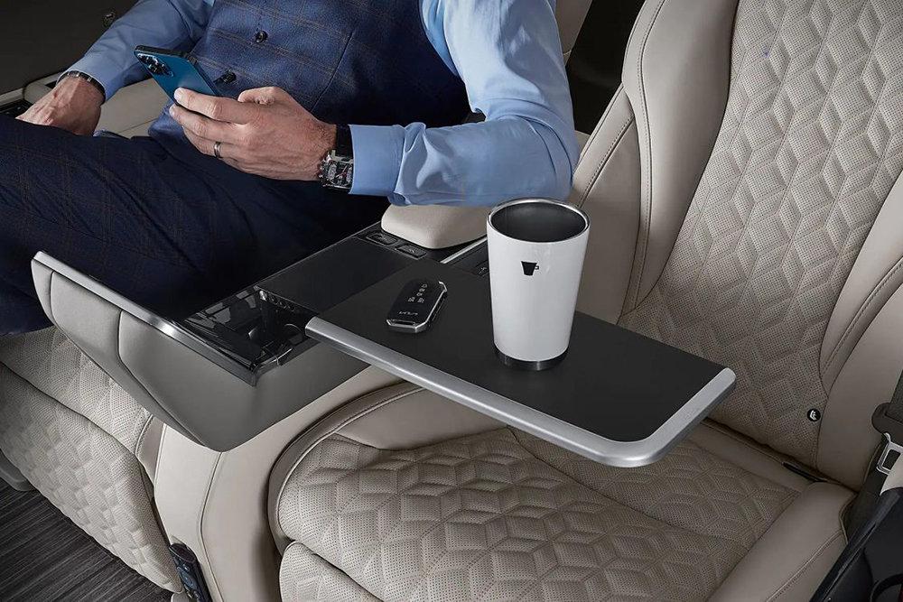Также для пассажиров второго ряда сидений предусмотрены боковые столики, дополнительные отделения для хранения мелких вещей, подстаканники с функциями подогрева и охлаждения, беспроводная зарядка мобильных устройств. В багажнике Kia Carnival HiLimousine есть вешалка со светодиодной подсветкой и ящик для обуви.