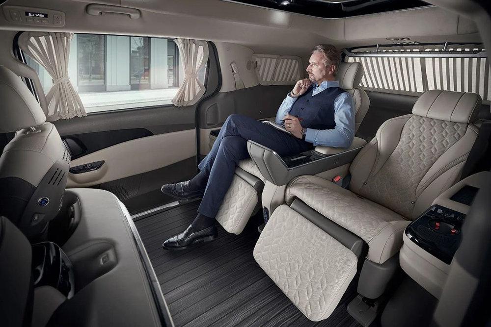 Задняя часть Carnival превратилась в настоящий зал с регулируемыми креслами с обивкой из кожи Nappa и выдвижной подставки для ног с электроприводом и массажёром. Регулировка всех параметров выполняется при помощи 7-дюймового тачскрина между сиденьями или приложения на смартфоне.