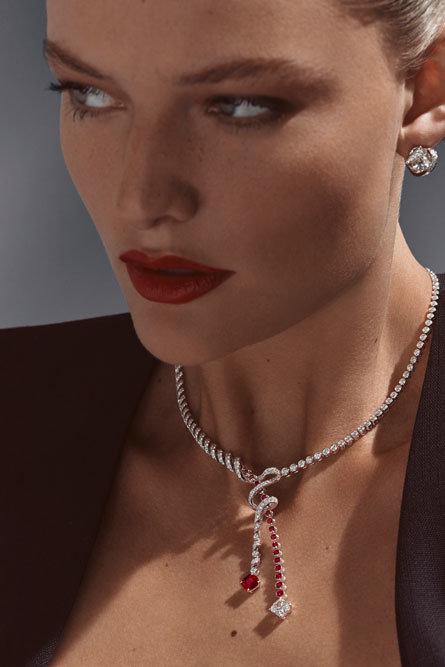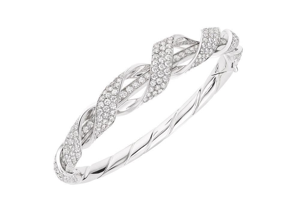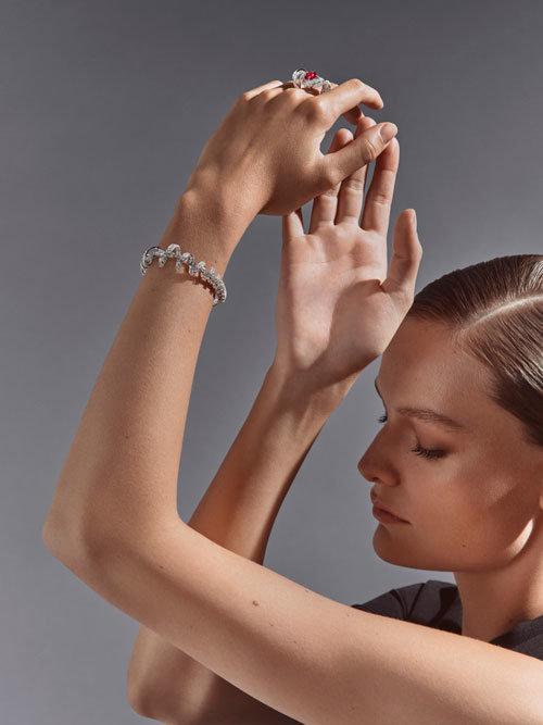 Асимметричное плетение на колье и браслете подчеркивает динамику изгибов. Завиток проходит также по всему браслету и миниатюрному циферблату драгоценных часов с бриллиантовым паве.