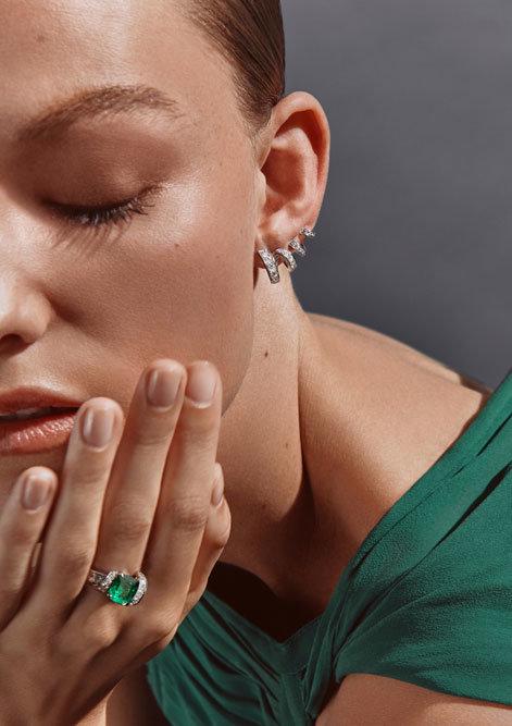 Эффектный колумбийский изумруд украшает другую бриллиантовую диадему. Он также включен в светящуюся спираль кольца.