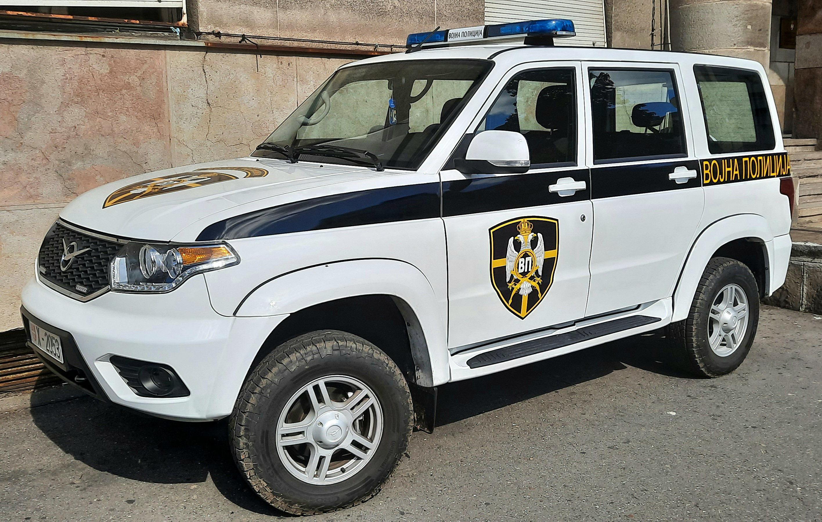 Военная полиция Сербии начала эксплуатацию внедорожника УАЗ "Патриот". Как сообщает ТАСС, автомобили имеют проблесковые маячки, а также на них нанесена традиционная черно-белая цветографическая схема с надписями "Воjна полициjа".